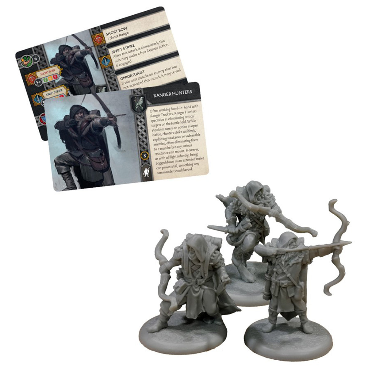 The Ranger Hunters Unit Box for the A Song of Ice and Fire: Tabletop Miniatures Game gives Night’s Watch Commanders a fast and agile unit on the battlefield. Their short bows can reach out and attack enemies before they can fight back. In melee, their Swift Strike attack allows them a free Retreat maneuver afterward. They also gain a bonus when attacking enemies that have yet to activate, allowing them to reroll misses once.
